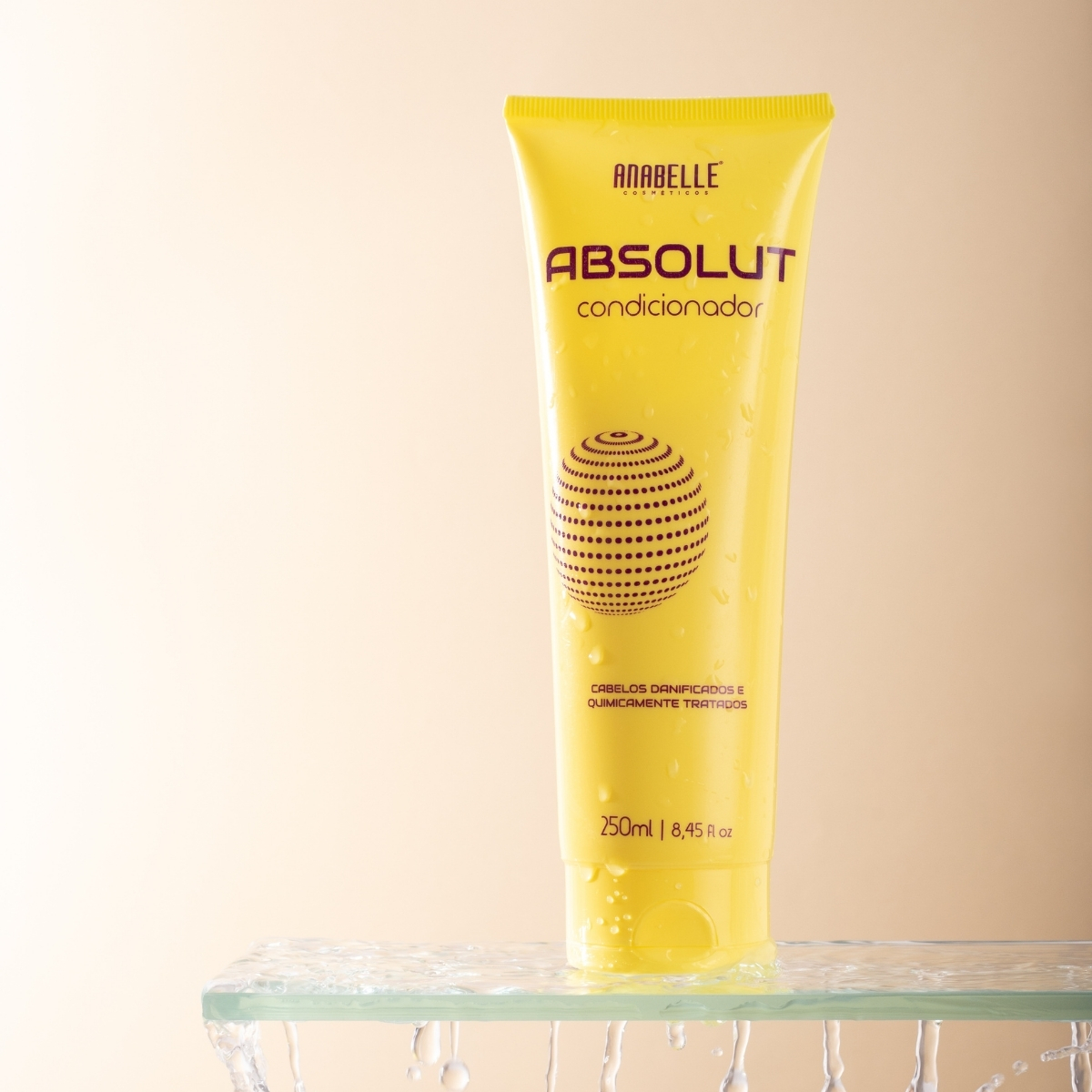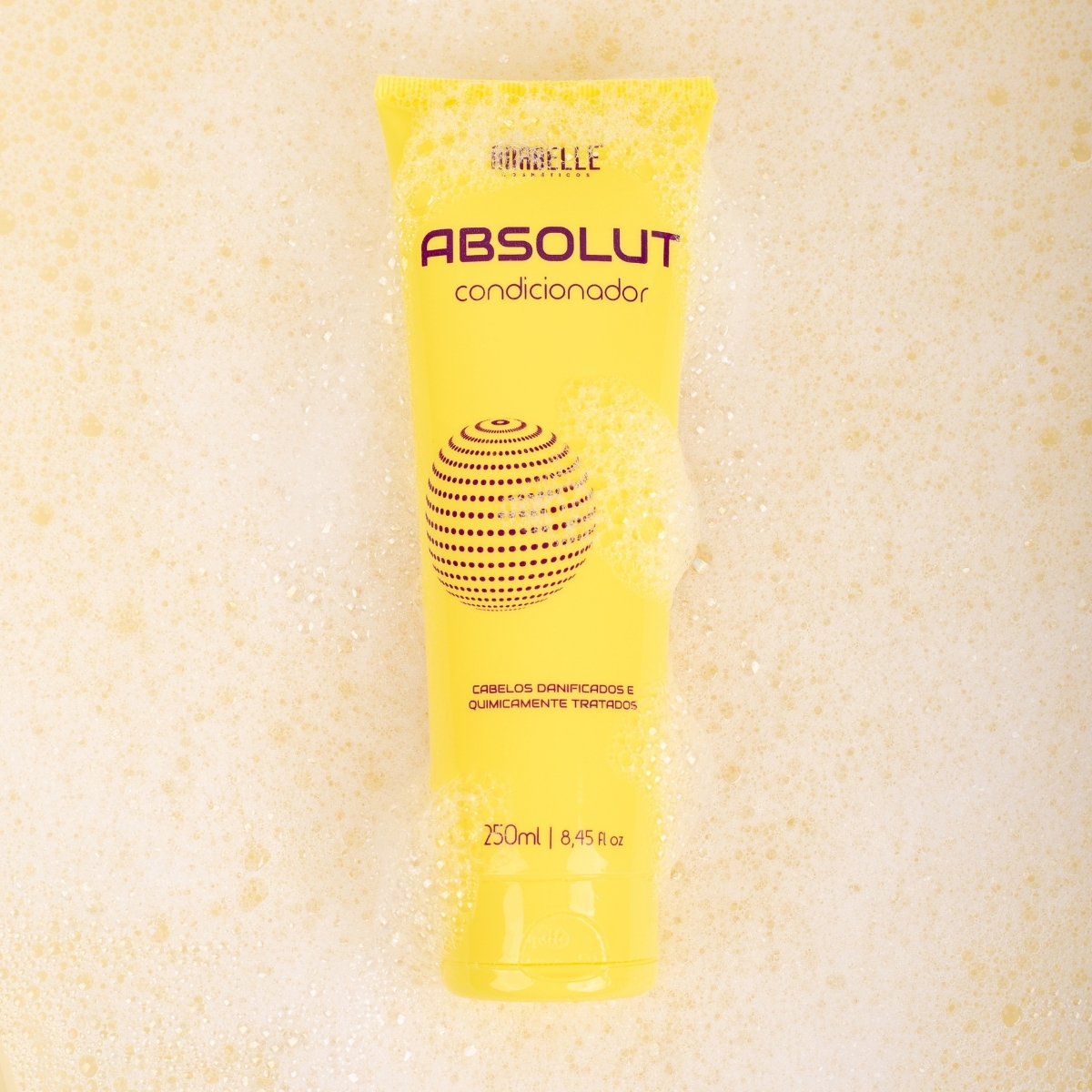 Condicionador Absolut 250ml com polímeros hidratantes e manteiga de karité. Hidrata, nutre e facilita o desembaraço dos fios.