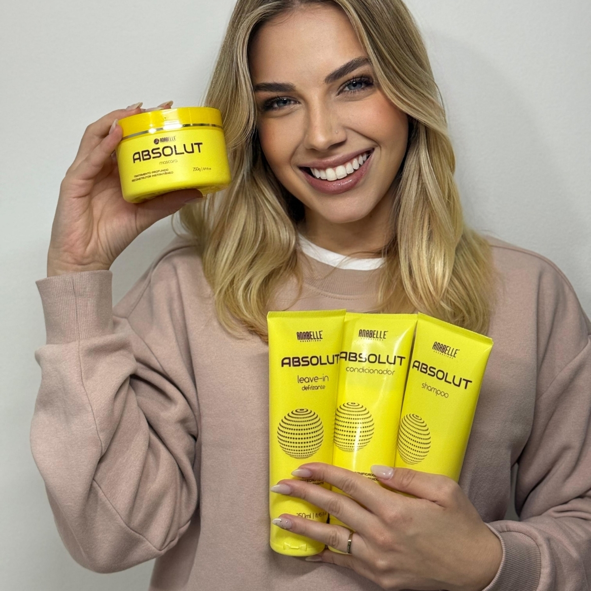 Condicionador Absolut: após o shampoo, aplique no comprimento e pontas, deixe agir por alguns minutos e enxágue.