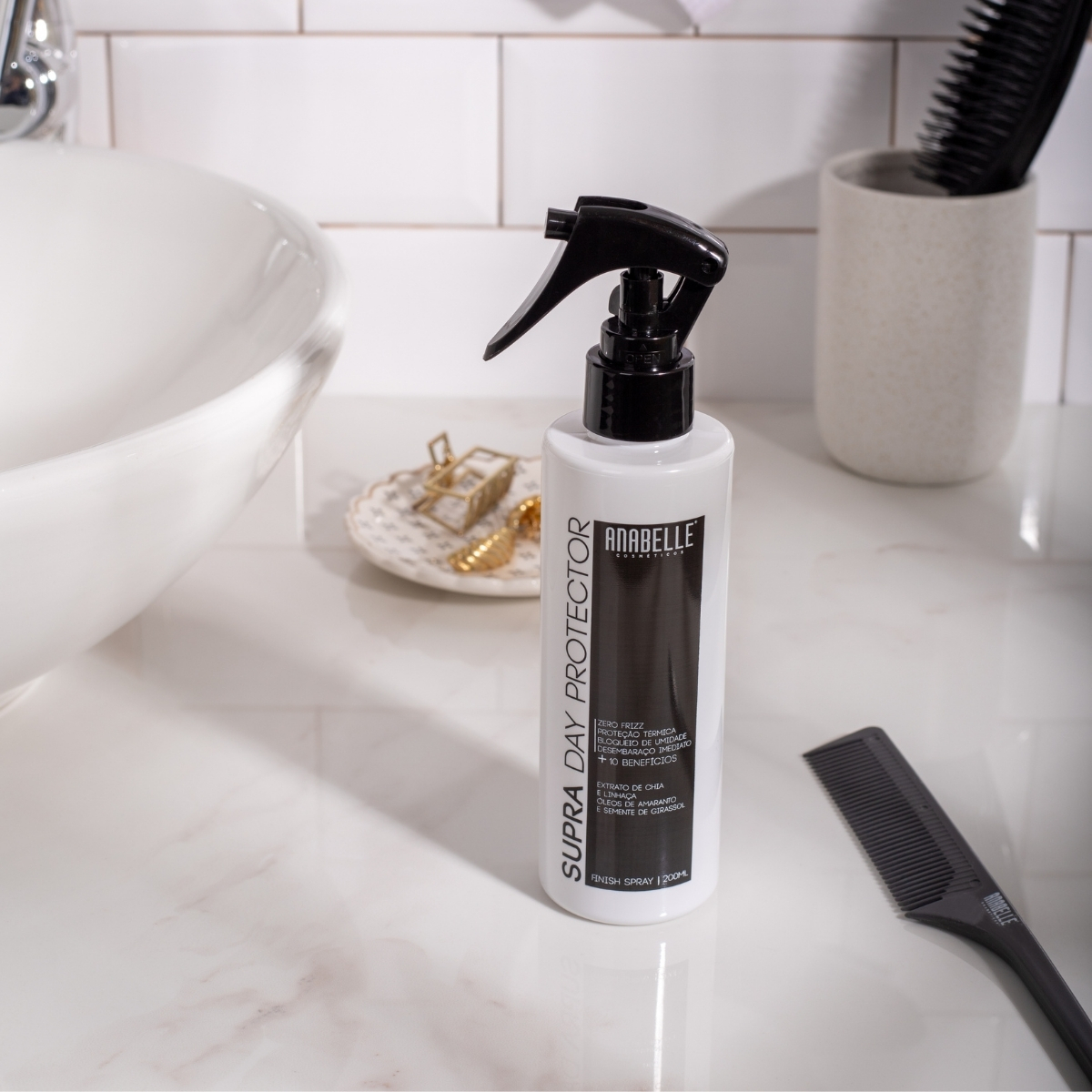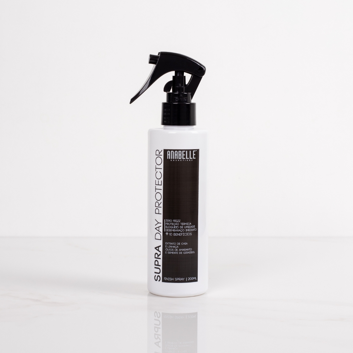 Supra Day Protector Anabelle® 200ml: leave-in multifuncional com 14 benefícios, proteção térmica, zero frizz, nutrição, brilho intenso e fios impecáveis.